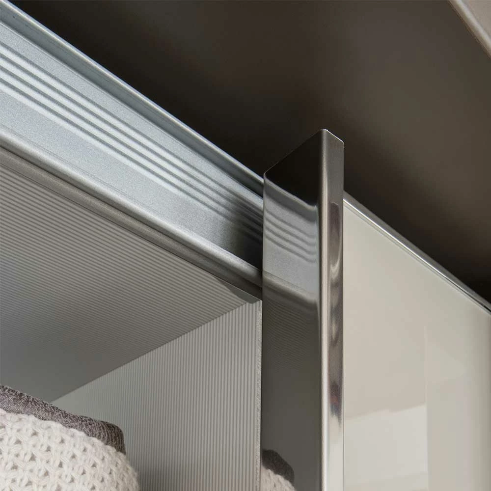 - Querriegel und Griffleisten aus verchromtem Metall werten die Optik auf