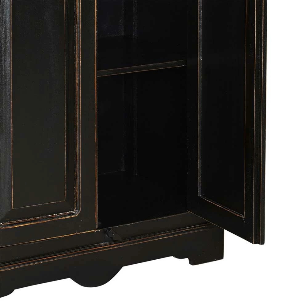 - Rahmen, Deckplatte und die Zierleisten sind aus Mangobaum Massivholz, die Füllungen, Rückwand und Einlegeböden sind aus hochwertiger MDF gefertigt