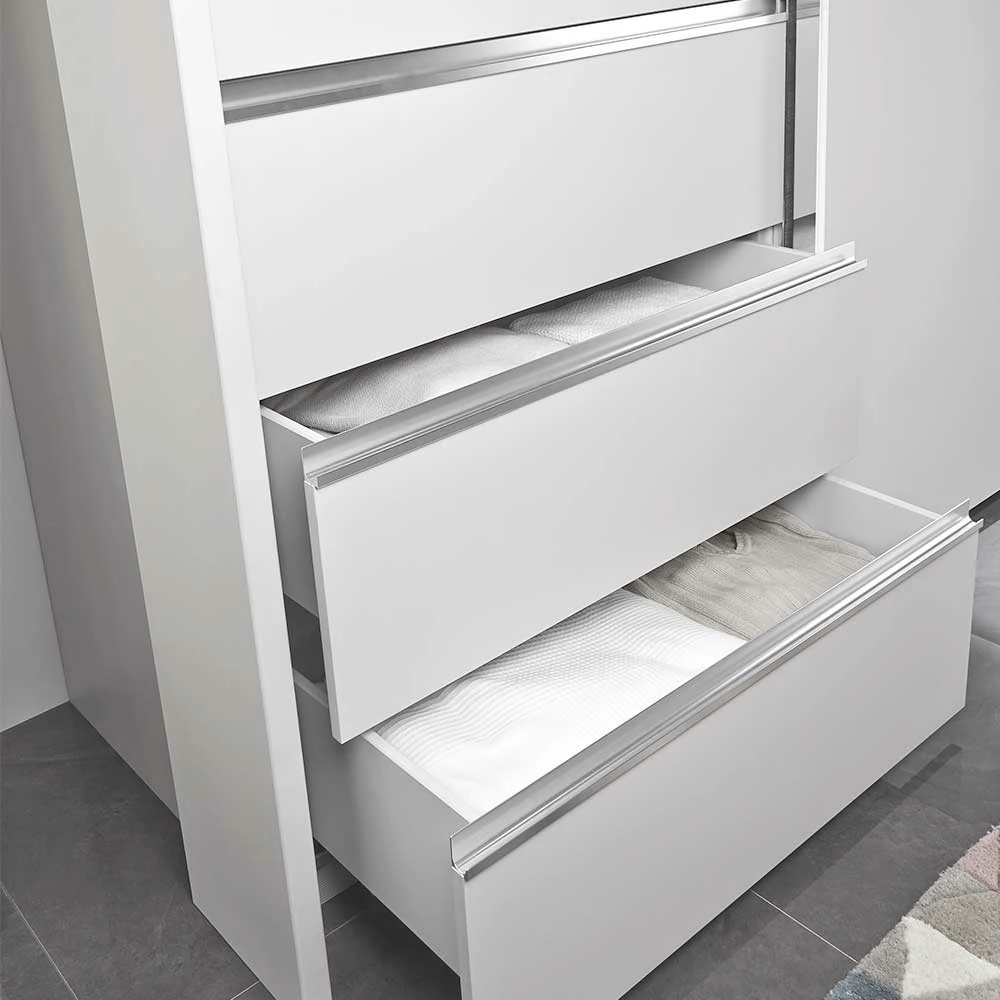 - Links drei Schubkästen mit Metallauszug, Soft-Close-Funktion und Selbsteinzug